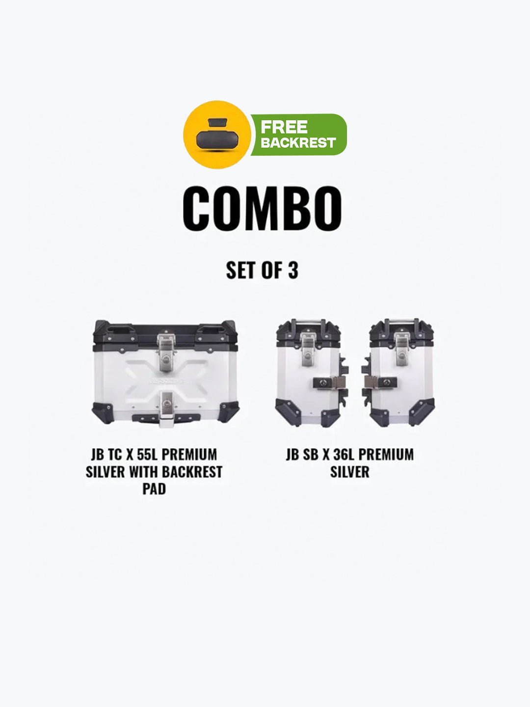 jb racing set of 3 combo of jb tc x 55l premium silver with backrest pad + jb sb x36l premium silver